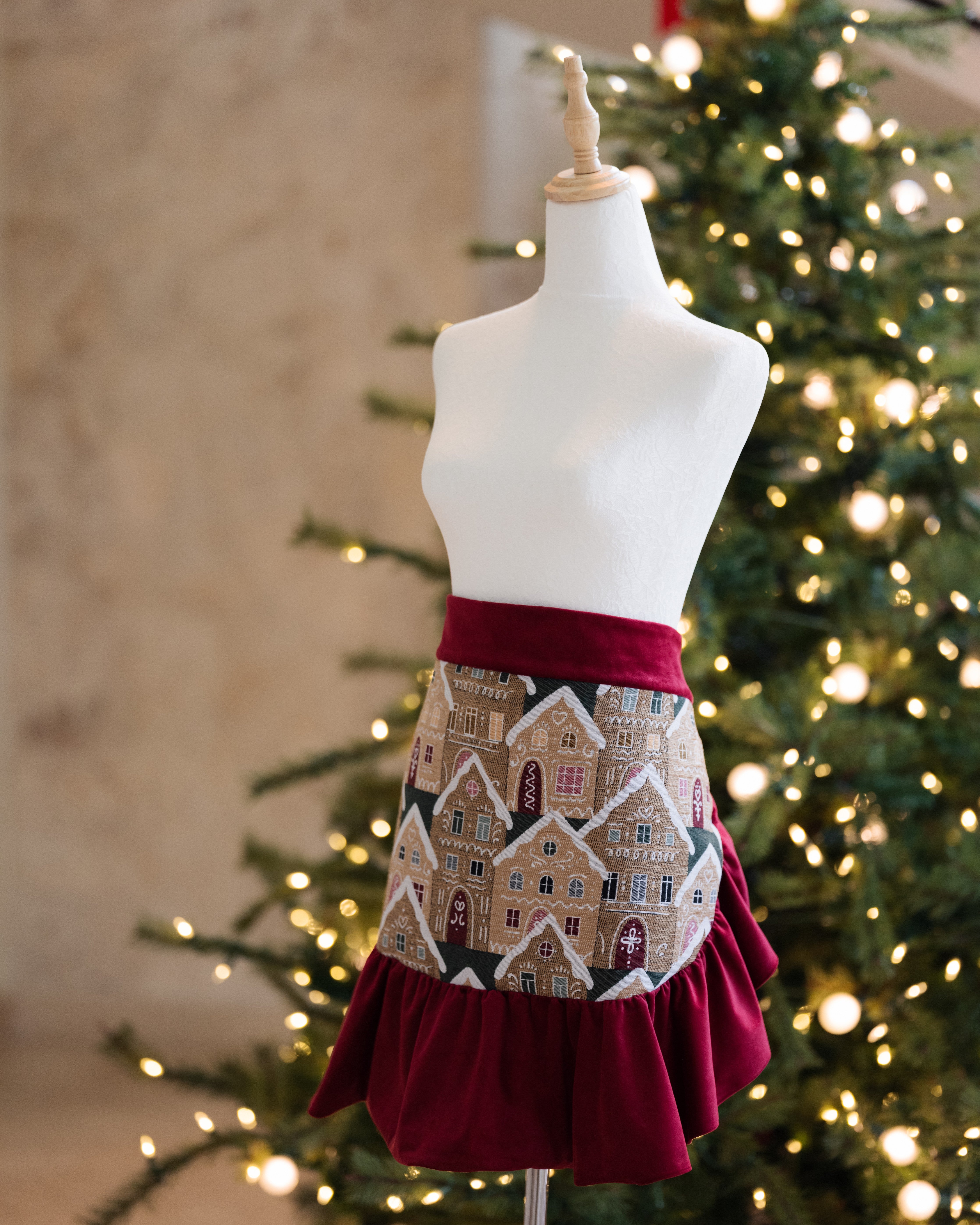 Delantal corto que captura la esencia de la repostería navideña. El panel central luce el encantador estampado de "Casitas de Jengibre" con detalles nevados sobre fondo oscuro (a juego con los manteles de la colección). Enmarcado por una ancha cinturilla y un volante fruncido en el bajo en rojo intenso, crea un contraste cálido y acogedor.