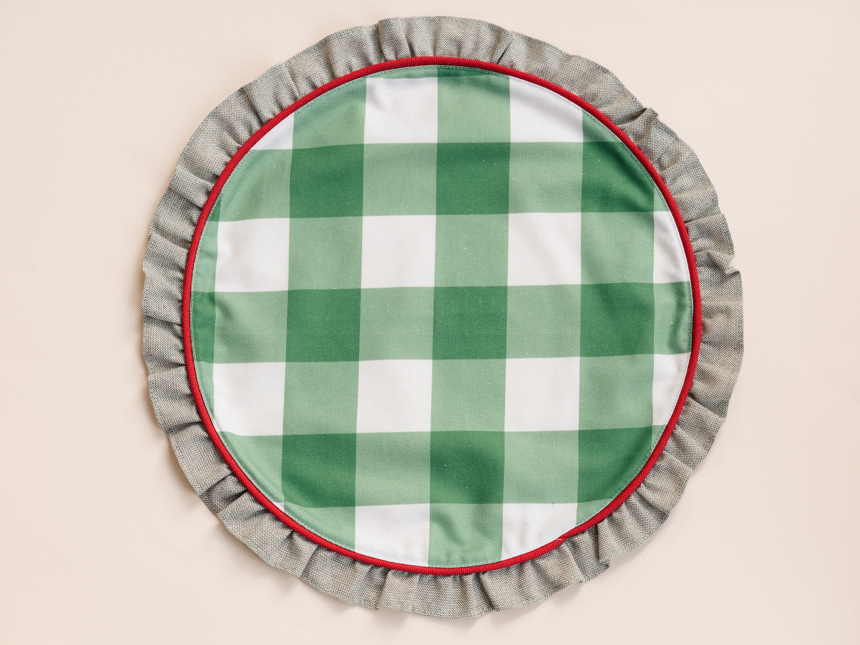 Mantel individual circular. Presenta un estampado de cuadros vichy grandes en tonos verdes y blancos. Detalle distintivo: un fino contorno en rojo intenso que perfila la circunferencia central, separando el estampado del volante fruncido de tela lisa verde claro.